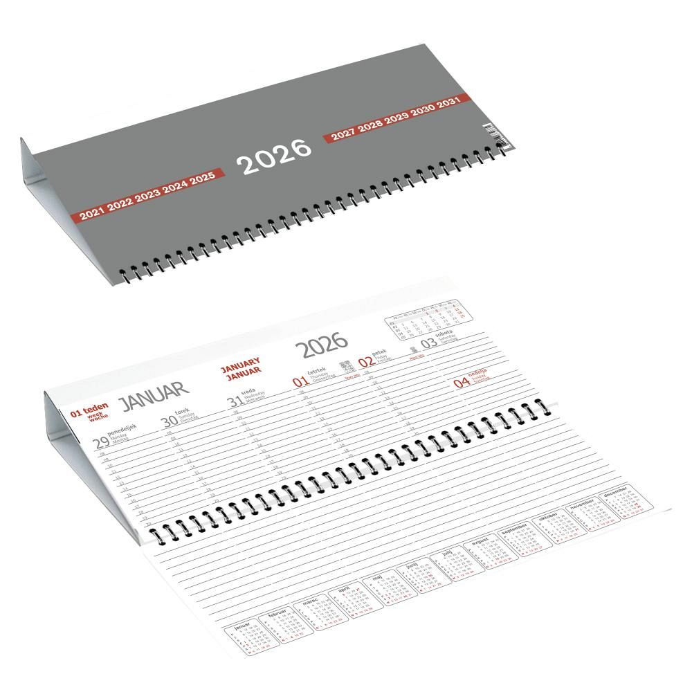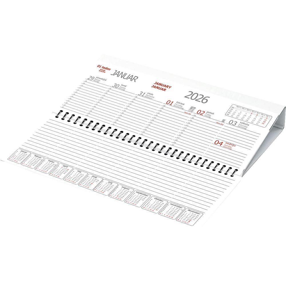 Namizni ležeči koledar za leto 2026. Organizirajte svoje leto z odličnim preglednim koledarjem, ki vsebuje vse pomembne podatke, kot so prazniki, lunine mene ipd. Vse oznake so navedene v slovenskem, angleškem in nemškem jeziku. Na vsaki strani je prikazan tedenski koledar s prostorom za zapiske in manjši mesečni koledar za orientacijo.