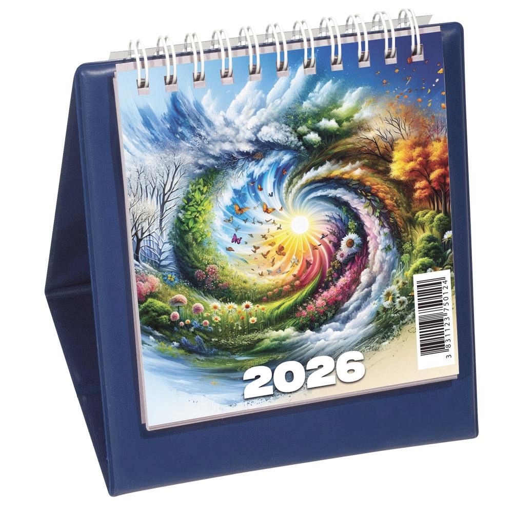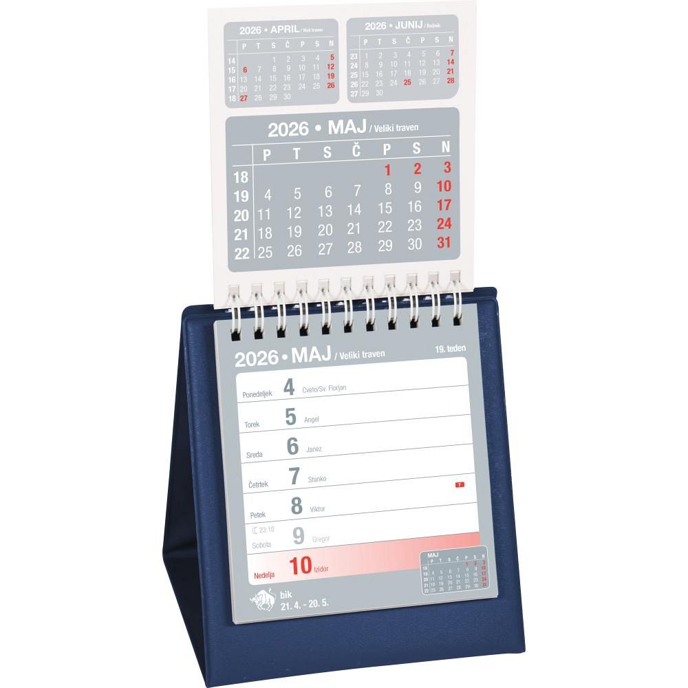 Namizni koledar v obliki piramide s spiralo zgoraj za leto 2026. Organizirajte svoje leto z odličnim preglednim koledarjem, ki vsebuje vse pomembne podatke, kot so prazniki, lunine mene ipd. Vse oznake so navedene v slovenskem, angleškem in nemškem jeziku. Na vsaki strani je prikazan tedenski koledar s prostorom za zapiske in manjši mesečni koledar za orientacijo.
